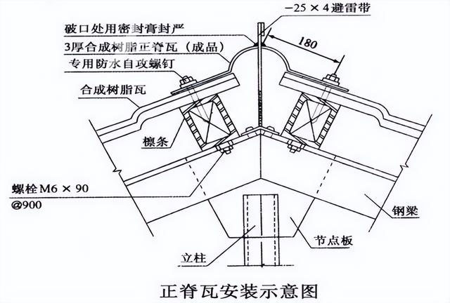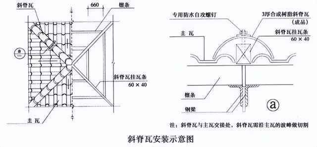 正脊瓦和斜脊瓦分別安裝在屋脊CD線和斜邊上。正脊瓦的安裝要從主瓦區(qū)的一側(cè)開始,確保第一張正脊瓦的搭接處不與主瓦的搭接處重疊,而是相互錯(cuò)開。兩張正脊瓦之間要搭接一個(gè)波形,以確保防水性能。斜脊瓦安裝在多坡屋面的斜邊上,要確保上下對齊并固定在主瓦的檁條上,兩節(jié)斜脊瓦之間要搭接30mm,最后安裝脊瓦的末端。